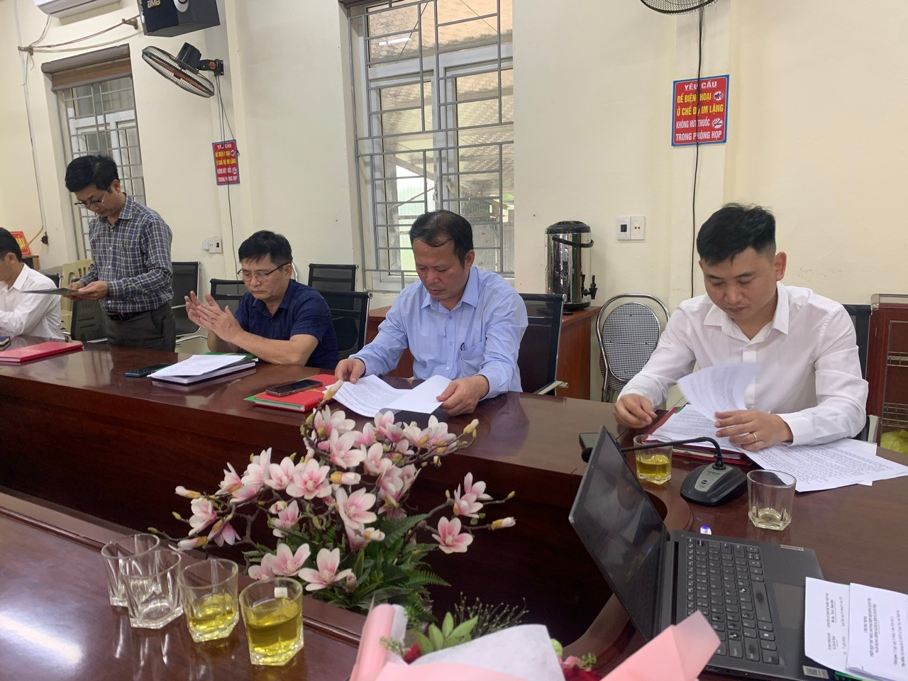 Đồng chí Phó Bí thư thường trực Đảng ủy xã trao Quyết định thành lập và tặng hoa chúc mừng Ban đại diện Hội đồng Quản trị Ngân hàng Chính sách xã hội xã Xuân Thái.