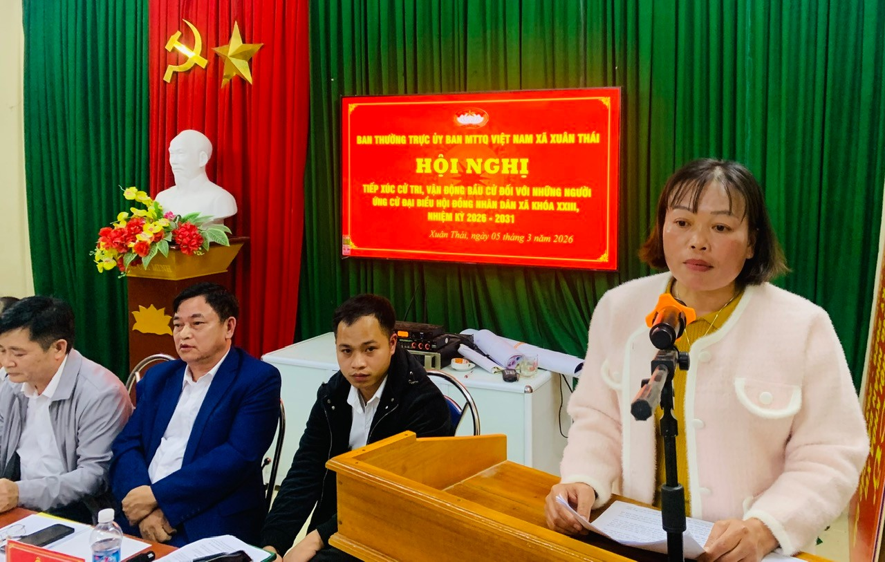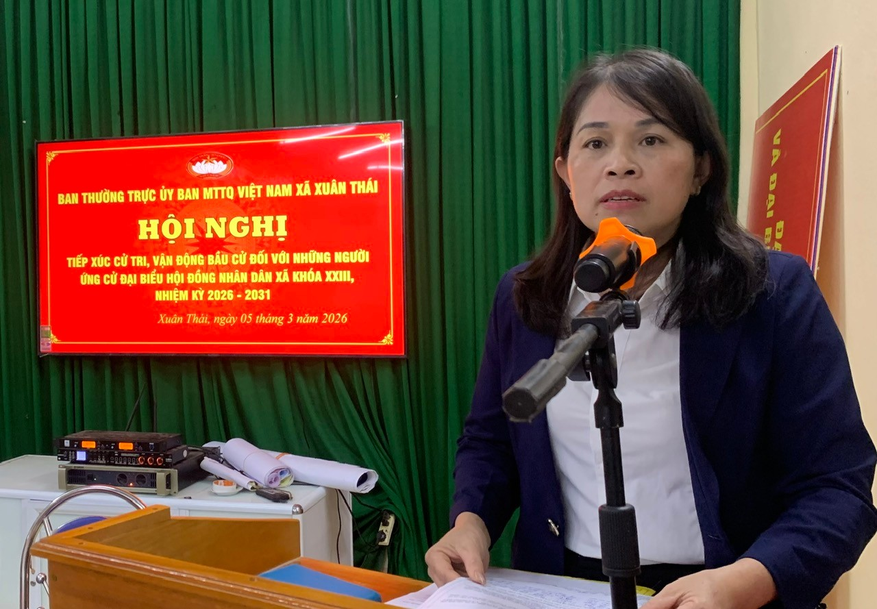 Tối ngày 05/3/2026, tại Nhà văn hóa thôn Đồng Lườn, xã Xuân Thái, Ban Thường trực Ủy ban MTTQ xã Xuân Thái đã tổ chức Hội nghị tiếp xúc cử tri, vận động bầu cử đối với những người ứng cử Đại biểu Hội đồng nhân dân xã Xuân Thái khóa XXIII, nhiệm kỳ 2026 - 2031, thuộc đơn vị bầu cử số 1, gồm Tổ bầu cử số 1 và số 2 của thôn Yên Khang và thôn Đồng Lườn.