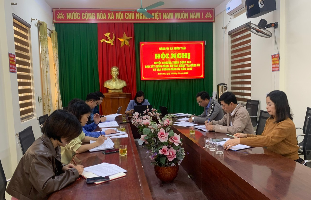 Thực hiện Quy chế làm việc của Đảng ủy nhiệm kỳ 2025–2030 và Chương trình công tác cấp ủy tháng 01 năm 2025, sáng ngày 20 tháng 01 năm 2026, Thường trực Đảng ủy xã Xuân Thái đã tổ chức Hội nghị duyệt Chương trình công tác năm 2026 đối với Ban xây dựng Đảng, Ủy ban Kiểm tra Đảng ủy và Văn phòng Đảng ủy.