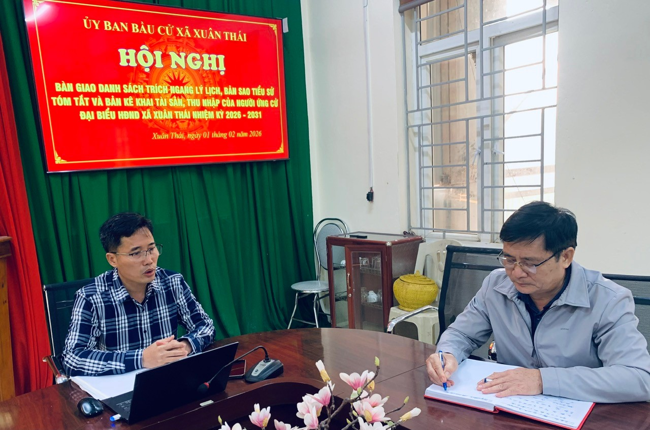 Thực hiện quy định tại Điều 36 Luật Bầu cử đại biểu Quốc hội và đại biểu Hội đồng nhân dân, chiều ngày 01/02/2026, Ủy ban bầu cử xã Xuân Thái phối hợp với Ban Thường trực Ủy ban Mặt trận Tổ quốc Việt Nam xã tổ chức Hội nghị bàn giao danh sách trích ngang lý lịch, bản sao tiểu sử tóm tắt và bản kê khai tài sản, thu nhập của những người ứng cử đại biểu Hội đồng nhân dân xã Xuân Thái, nhiệm kỳ 2026 – 2031.